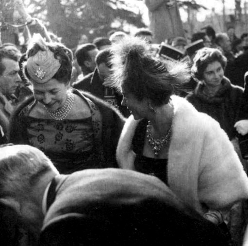 Madame walks with HM The Queen of The Hellenes, Frederika, on the day of the wedding of her daughter HRH Princess Hélène of France to Comte Evrard de Limburg-Stirum, at the Royal Chapel of Dreux in 1957. Behind them, HRH Princess Sofia of Greece and Denmark.