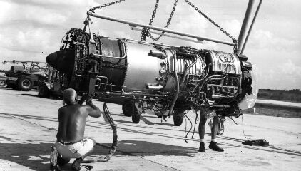 A Regulus II General Electric J79 jet engine being overhauled.