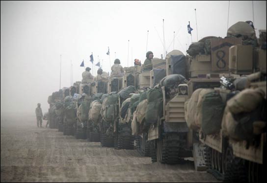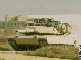 A U.S. M1A1 Abrams tank moves across the runways of Saddam