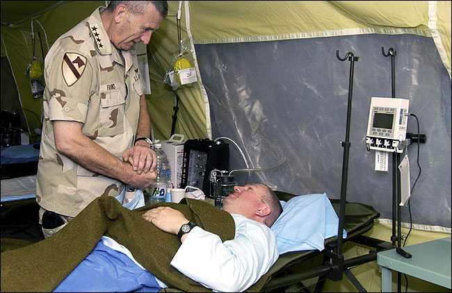 Franks visits a wounded soldier, Pfc. Patrick McDermott, at the