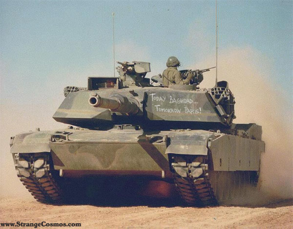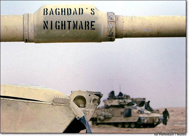 "Baghdad's nightmare" stenciled on its cannon passes troops relaxing