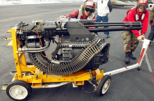 Ordnance specialists convey a M61A1 Vulcan cannon, a