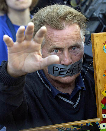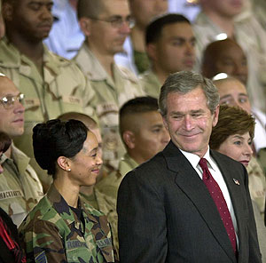 | Maj. Gen. Stanley McChrystal, left, and Department of Defense spokeswoman Victoria Clarke brief reporters on the progress of the war with Iraq during a news conference at the Pentagon, Wednesday, March 26, 2003. | Actor Martin Sheen prays during a prayer vigil for peace and the safe return of U.S. soldiers at the Federal Building in Los Angeles, on Wednesday, March 26, 2003. | U.S. Air Force personnel share their grief on the tarmac at Bagram Air Base in Afghanistan on Tuesday, March 25, 2003, following a memorial ceremony to transfer back to the United States the remains of six airmen killed Sunday. A U.S. Air Force HH-60G Pave Hawk helicopter crashed 18 miles north of Ghazni in south Afghanistan on Sunday, killing all six Air Force members on board. |