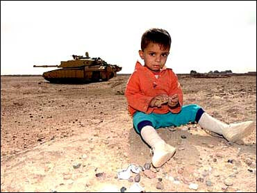| An Iraqi child sits on the ground as the 2nd Royal Tank Regiment of the British Army passes by, near Basra, March 26, 2003 | A U.S. Air Force F-16 Fighting Falcon takes off from its base in Kuwait, March 26, 2003. | President George W. Bush glances back at a soldier while waiting to be introduced to the podium during his visit to Central Command |