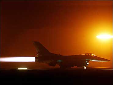| A F/A-18 Hornet launches from the flight deck of the USS Harry S. Truman for a strike against Iraq, early Wednesday, March 26, 2003 | A B-1 Bomber proceeds on its mission after receiving fuel from a KC-135 Stratotanker in the skies near Iraq on March 25 in support of Operation Iraqi Freedom. | U.S. Marines from the 2nd Battalion, 8th Regiment guard their positions late Tuesday in Nasiriyah, Iraq |