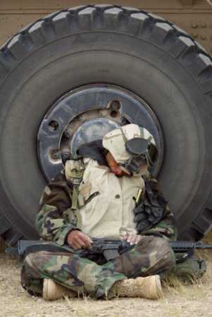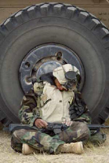 A U.S. soldier rests while on patrol near Harir