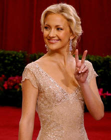 Actress Kate Hudson flashes a peace sign as she poses