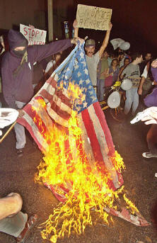 representing the US flag during a protest of some 300 people against