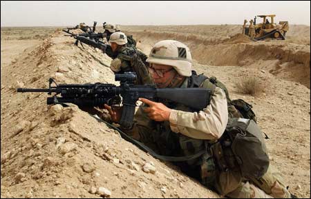 | Soldiers from the U.S. 101st Airborne Division rest in foxholes by their convoy in a staging area in the Kuwaiti desert | U.S. Army infantry troops hold a position just 75 feet from the Iraqi border while Kuwaiti bulldozers widen a ditch crossing at a UN border checkpoint in the demilitarized zone between Kuwait and Iraq | Austin resident Dick Underhill, 63, who says he served eight years in the U.S. military, protests with others Friday outside the state Capitol |