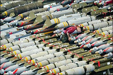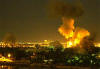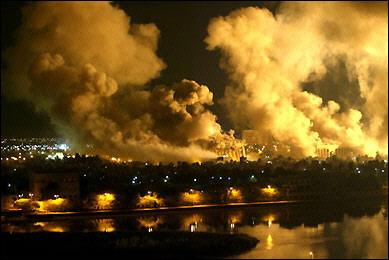| U.S. Marines from the 15th Marine Expeditionary Unit help an Iraqi soldier with water from a canteen in southern Iraq | Smoke covers the presidential palace compound in Baghdad during a massive US-led air raid on the Iraqi capital | A US Navy ordnance handler checks the nose of a laser-guided MK 82 500-pound bomb in the hangar bay of the USS Kitty Hawk, amid 1,000 and 2,000-pound bombs |
