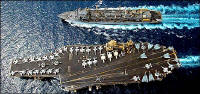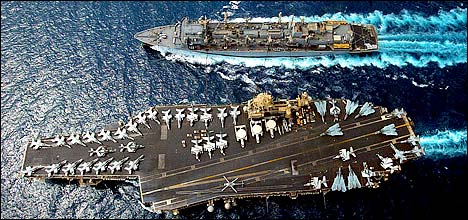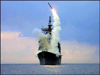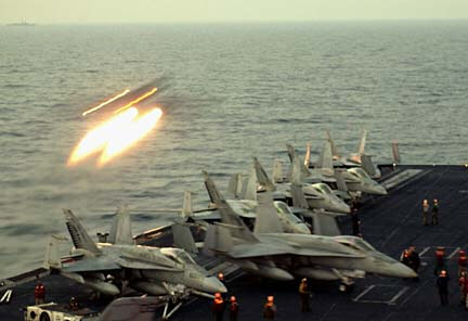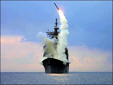 | Tomahawk Land Attack Missile (TLAM) is launched from the guided missile cruiser USS Cape St. George in the eastern Mediterranean Sea Sunday, March, 23, 2003. | U.S. Marines from the 15 Marine Expeditionary Unit take cover as bombs are dropped during a pitched battle at the main Gulf port in Umm Qsar Sunday, March 23, 2003. | A bird's-eye view of the aircraft carrier Kitty Hawk being docked by the combat support ship Camden in the Persian Gulf. |
