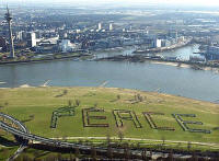 | The afterburners of an F-14A Tomcat light up the evening sky as it is launched off the deck of the aircraft carrier USS Kitty Hawk in the Gulf on Sunday, March 23, 2003 | Several thousand people gathered to shape the word "peace" next to the river Rhine in Duesseldorf, western Germany, on Saturday, March 22, 2003. | A U.S. Army M-1A1 Abrams tank of the 3rd Infantry Division advances near the Iraqi city of An Najaf, about 100 south of Baghdad. |