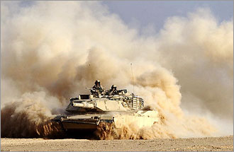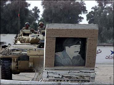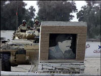 | Members of the Royal Fusiliers, known as the Desert Rats, drive their Warrior tank into a monument of Saddam Hussein in Basra, southern Iraq, on Monday |