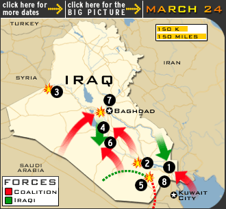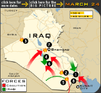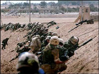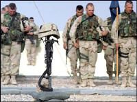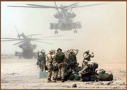 | Marines are dropped off to support forces bogged down on the way to Baghdad | Army Pfc. Patrick Miller, second from left, is one of five prisoners of war shown Sunday on Iraqi television. Here, he is shown with his family in a photo taken in May 24, 200 | Soldiers of 1st Brigade, 101st Airborne Division (Air Assault), mourn the loss of Capt. Christopher Seifert at a memorial ceremony at Camp Pennsylvania in Kuwait. Seifert was killed when a grenade was thrown into a tent early Sunday by a fellow U.S. soldier |