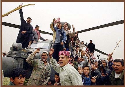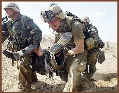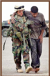 | Iraqis pose with downed US Apache | Marines evacuate one of their own at a battle at Nasiriah | A Marine helps a wounded Iraqi Prisoner of War |