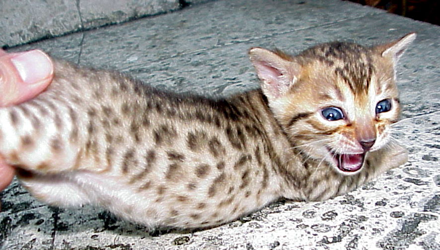 Male #1 - Amazing rosetted chaotic pattern with very light background, nice outlining and and rufous filled rosettes. Great playful temperament, big eyes and whisker pads. Top show/breeder potential.
