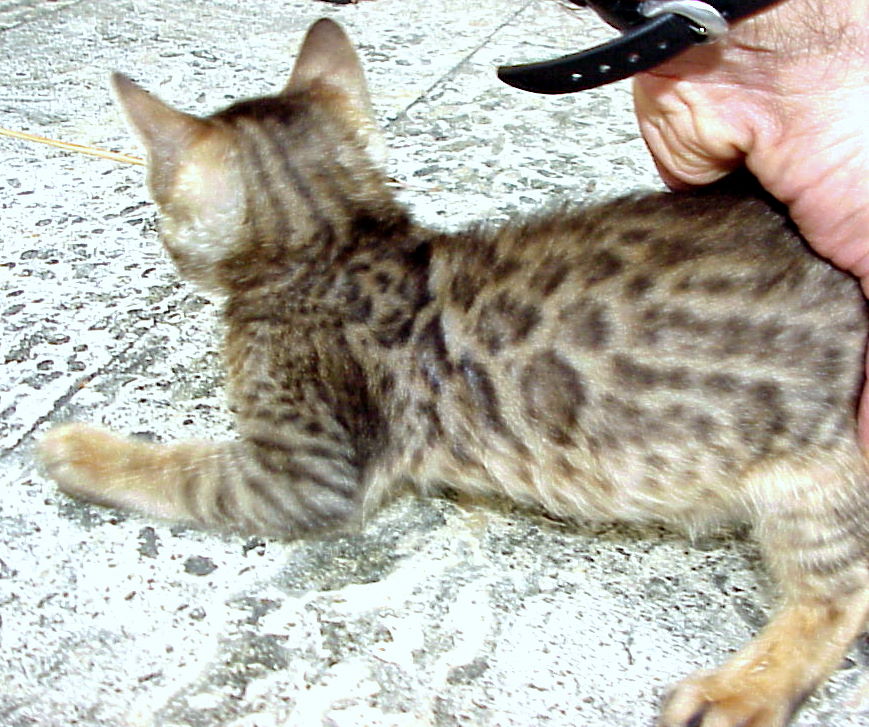 Male #2 - This kitten is covered with small, horizontally alligned, paw-print, rosettes with outstanding contrast. As his color comes in, his rosettes will keep their black outlining into adulthood. "Safari" on our Gallery page (male#2 in 9-27-06 litter) looked similar as a kitten. Show/breeder potential or a special pet for this easy going fellow. (On hold for Tabitha and Paul)