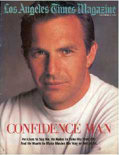”the crew took the lead from him,” Wilson recalls. “if he was willing to get up at 5, turn in at midnight and go out in his shirt sleeves in sub-zero weather, you follow the idiot.” Blake agrees: “Kevin gives the impression he’s just a regular guy, which puts people at their ease-but he’s an adventurer, curious to see how far he can go. “Dances” pushed him to his outer limits.” Physically as well as mentally, it seems, Costner was on horseback, directing a buffalo hunt scene, when an Indian rider lost control of his horse and crashed into him. The impact knocked Costner out of the saddle and twisted him round backward midair. “He hit the ground as hard as you can hit it, bounced two or three feet in the air and rolled over like a sack of grain,” Blake says with a shudder. “If a buffalo had been behind him, he would have been seriously hurt. Everyone held their breath as Kevin sat up, brushed himself off, got on another horse and continued. He never said a word.” Actually , says Costner, Day 1 was his profound test. “Everyone told me to make sure I knew where to put the camera so the crew would feel I was in charge,” he says with a smile, “I’d set up the first two shots weeks in advance, but two minutes into things, I knew that the geography was working against me, that my calculations were wrong. Instead of locking in, I proceeded to move the camera to another spot. That was the moment I knew I could do it, that I wouldn’t be constrained by any insecurity.” COSTNER’S FRIENDS describe him as “street smart”, an out growth, no doubt, of his early years. Because his father, an executive with Pacific Bell, was frequently transferred, Kevin attended four different high schools around the state and felt perpetually on the periphery. “the fact that I was 5-2 as a sophomore didn’t help,” he says. “I’m 6-1 now but still relate to those feelings. I didn’t date in high school and didn’t’ get my growth until college. I never got over being short”. Always what he terms “performance oriented,” Costner sang in an all boys choir. “That’s when I first realized I could manipulate audiences,” he says. “Music has always made me very happy. You get an immediate response from people.” Sports, too, were an ego boost for Costner, who earned varsity letters in baseballs, and basketball. “I did feel special as a kid,” he says. “Not better, but special…..And there’s no crime in that.” After graduating from villa Park High School in Orange County, Costner enrolled at Cal State Fullerton, arbitrarily choosing marketing as his major. Pledging Delta Chi, he met Cindy Silva at a fraternity party. She was the first woman, he says, that he “really dated”. The two of them became inseparable and were married 2 ½ years later, while they were still in college. Costner didn’t consider acting until his senior year. Fighting sleep in an accounting class, he picked up a copy of the college newspaper, saw a casting call notice and decided to try out for “Rumpelstiltskin.” “I had grown a bit, so I knew I couldn’t play the dwarf,” he deadpans. “But I knew there had to be a prince. I lost the audition because I had no tools. Good looks didn’t help me at all, which is why I never counted on them. I knew right then, though, that I wanted to be an actor more than anything, to be behind that door. There seemed to be something magical there.” He headed for the South Coast Actors Coop once, then twice, then five times a week. In his first serious effort-Arthur Laurents’ “Invitation to a March” at the Costa Messa Civic Playhouse-“I was horrible,” he says. “but in acting, you reserve the rioght to improve-and I’ve always gotten fueled by my disasters.” Costner took a job in a family construction business- a position he disliked immediately and abandoned after 30 days. While Cindy stayed in Orange County to finish school, he headed for Hollywood, attending a film budgeting class at UCLA and sleeping in the back of a truck in a parking lot at Sunset and La Brea. Cindy soon followed-albeit with trepidation. “The vows say ‘for better and for worse, richer or poorer,’” he says. “She probably thought it was ‘worse’ and ‘poorer’ from the outset.” Costner became a stage manager at Raleigh Studios, an independent, all purpose production facility that makes commercials, features and videos, where he coordinated the equipment for each production. Answering ads in Drama Logue, he lined up bit parts in two low budget, lower caliber films. The experience was a turning point, of sorts. “They started with the lowest common denominator and settled for less than that,” he says. “There was a noticeable lack of invention. From that point on, I resolved to hold out for only the best. It’s easy to have conviction when your powerful, much less so when you’re nobody, which is when it counts.” Costner started saying no early on. Hired to pose as a young Luther Adler for a photograph to be used in the 1982 film “Frances,” he was ultimately offered a small walk on role. His one line-“Goodnight, Frances,” delivered to Jessica Lange-would have earned him a Screen Actors Guild card, a prerequisite for union auditions that had eluded him for six years. When it came to delivering the line, however, Costner balked. “Frances had all these autograph hounds around her, and I didn’t want to interrupt. I didn’t know how to make the line work. It drove everyone crazy. ‘Just say it’ they yelled-and finally I did. But so quietly that the sound guy shook his head.” Later, Costner passed on a chance to read for the Tom Berenger role in “Platoon” for fear of offending his brother, a decorated Vietnam War vet. He also turned down the role of J. Robert Oppenheimer in “Fat Man and Little Boy” because he doubted that anyone would believe he had an I.Q. of 160. “Like Steve McQueen, with whom we both sh