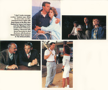ALL THE RIGHT MOVES How Kevin Costner Became a Leading Man in 10 (Not So Easy) Years By Leslie Van Buskirk Photographed by Timothy White He is, on the surface, and ordinary man. Brought up in that particular middle class American way, his demographic profile contains all of the characteristics of an EVERYMAN: baseball, basketball, awkwardness around the opposite sex, camping with Dad, average academic grades, the inferiority complex resulting from being only five two in the tenth grade. After a stint at an okay but not great College, he marries his sweetheart, gets a job where he works mainly with his hands and starts a family. Now, for most people, life pretty much travels a well-traveled route after that, albeit with a few curves and bumps along the way. But not this guy’s life: somehow, he ends up in a place altogether different. This average Joe’s name is Kevin Costner, and in the world of movies and leading men he is king. Sure, there are other male movie stars possessing looks and charm, who will survive through the next decade of films. There are Tom Hanks, Michael Keaton, Eddie Murphy and in particular, Mel Gibson and Tom Cruise, who, along with Costner, are Hollywood’s Golden Guys. Costner does not possess the high voltage grin and clean-cut freshness of Cruise: nor does he possess the guileless blue eyes and edgy manner of Gibson. Costner has something that is all his: the kind of accessible appeal that turns an otherwise ordinary man into a hero. Good looking but frayed enough to make him real, Costner is a regular guy. ”I’ve been very lucky with stuff,” Costner says modestly.” But lot of the movies end up doing no one really wants to make – I think people were laughing. Nobody wanted to make No Way Out, nobody wanted to make Bull Durham, and for the longest time nobody wanted to make Field of Dreams.” They’re not laughing anymore. Costner is a man’s man and a woman’s dream, and his name above a movie title ensures a healthy box office. For Costner, that translates into 1987’s The Untouchables and No Way Out, last year’s Bull Durham and his most recent smash, Field of Dreams. Heady stuff for a two-year span. But don’t be fooled: it only seems as if Costner, 34, made it overnight. In reality, he’s been chasing his own dream for a decade. Across the street from Paramount Studios in Los Angeles there is a set of nondescript offices housing various production companies. One of these companies is Costner’s own, called TIG Productions, after his grandmother's nickname. It’s ironic, this location, because it is where he began his professional career 10 years ago, at a place called Raleigh Studios. The son of a utilities worker whose job required several moves (his mother worked for the welfare department), Costner switched schools throughout his childhood. After graduating from Cal State at Fullerton with a business degree and a vague ambition to act ,he married fellow student Cindy Silva. He then accepted an office job but, bored with the nine to five grind, quit after just 30 days. In 1979, the then 24-year-old was working as a stage manager for Raleigh, a small company that produced commercials and independent films. As such, he was sort of a jack-of-all-trades, doing whatever needed to get done, which involved mostly physical labor. In that same year, a low budget T & A picture entitled Malibu Hot Summer (later changed to Sizzle Beach, U.S.A.) was being cast at the studios. While Costner probably could have walked the few feet over to the director, Richard Brander, and asked for an audition, he chose to mail a picture and a resume. Costner found himself with the second male lead, playing a wealthy cowboy who falls in love with a well-endowed young lady (played by the director's wife, Leslie Brander). The sexploitation flick not only is Costner's film debut, but also contains his first celluloid love scene. Years later, the actor's love scenes in movies like No Way Out and Bull Durham would be called some of the hottest in cinema history. We always laugh about that," says Sizzle Beach producer Eric Louzil, now a low budget movie director. "He had to do a scene where he's making love to the director's wife, in front of a fireplace. He was real nervous and stiff. He kissed her, but it was like he wasn't into it." Costner, who wasn't even paid to be in the movie, tells interviewers he did the movie for the experience and "didn't work for six years after that." But, in fact, for the next five years, the actor did work, albeit sporadically, going back and forth between tiny roles in A-list movies and leading roles in lesser pictures. A casting director at Francis Ford Coppola's Zoetrope Studios during this period remembers Costner vividly. "Somebody called and told me about this guy who was really nice and good-looking and said we should use him as an extra or something," recalls Jane Jenkins, who cast, among other movies, Willow and License to Kill. "So Kevin came over and he was a big, tall guy who was good-looking and smart. So we put him in Frances”. His role in the 1982 biography of Frances Farmer, starring Jessica Lange, ended up on the cutting groom floor. Apparently, Costner and Frances director Graeme Clifford didn't see eye to eye on the one line the actor had in the movie; the outcome was that Costner refused to say the line. Another bit part, in Coppola's One From the Heart, was cut out before he wound up with one line in the 1982 smash Night Shift (look at the scene in which some fraternity members invade the morgue; the 1st frat boy is Costner). A small role as a newlywed in 1983's Table for Five, starring John Voight, was also edited out. Then came his greatest cut of all: his now infamous role as the suicide victim whose funeral brings together a group of friends in The Big Chill. Perhaps thinking that this was finally his big break, Costner turned down a role in War Games in order to work with the likes of Glenn Close, William Hurt