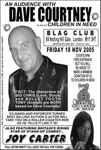Dave is doing his bit for Children In Need and its free entry! Take a big wedge though as you will be expected to dig dip and donate generously for the charity during the evening! The venue is The Blag Club in Notting Hill, right next to the Tube Station, 18 Nov 05, arrive early as its first come first served but by 7.45pm at the latest.