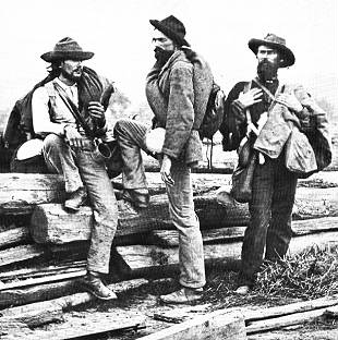 Above(Centered): Union Soldiers called Confederates, "Johnny Rebs", or "Rebels". This picture shows three Confederate Soldiers, resting out on some wood chunks. |