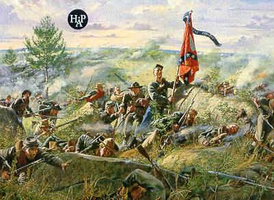 Above (Centered): Confederate Soldiers try to capture Little Round Top. Their Objective(s): The main objective(s) of this battle, for the Confederacy, was\were to "punch through the Union lines and move north. Lee wanted to blow up the railroad bridge at Harrisburg, then turn his attention to Philadelphia, Baltimore, or Washington; he was getting desperate." |