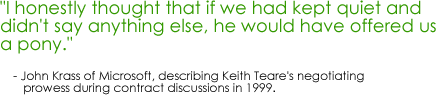 We will never know if Microsoft would've agreed to the deal without the $40 million guarantee. Maybe they would have, and maybe they wouldn't. We'll never know because Keith was so desperate to get the deal and get his IPO back on track that he offered up the kitchen sink. However, here is an interesting story that provides some clue as to what might have happened had Keith not jumped in. John Krass once joked with some RealNames people about the original negotiation of the RealNames/Microsoft agreement. When it was noted that Microsoft repeatedly used the tactics you learn in Negotiating 101 -- the "higher authority" trick and especially the "stay silent and let your opponent fill the void" trick. John laughed and said, "Yeah, I honestly thought that if we had kept quiet and not said anything else, he would have offered us a pony."