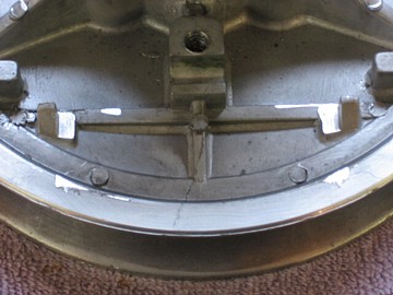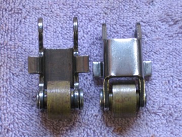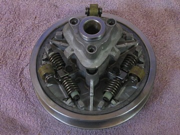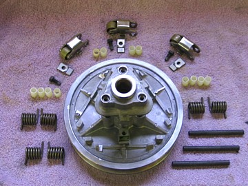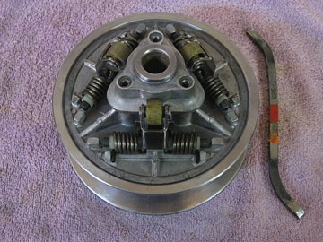 Here is the Salsbury clutch with the "Hi Rev" kit rollers and springs. * * * Because this clutch is a newer version that uses the small diameter springs, some modifications had to be done to work with the older springs. On the right side you can see the unmodified spring stop and on the left side you can see how much was removed.