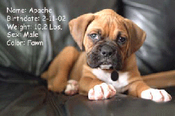 Hi my name is Apache and I am a 4 month old 30.7lbs. flashy fawn male. I have my natural floppy ears and a croped tail (it's a nub). The above picture was sent out to everyone to announce my arrival to my forever home (at that time I was 7 weeks and weighed 10.2 lbs.). Mommy says I'm going to be a BIG boy.