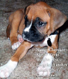 Hi my name is Cherokee and I am a 15 month old 54lbs. flashy fawn female. I have my natural ears and even my natural tail (it's long). The picture above was made to announce my arrival at my forever home (at that time I was 9 weeks and I weighed 7 lbs.).