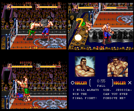 "Eh? What's this game got to do with Final Fight?" I here you shout out quietly. Well this game has a 2 characters from Final Fight in it, these being Haggar and Jessica. The game was released in 1993 and coveted to the SNES and Mega Drive in 1994. This game was a wrestling game with a few modes such as team battle royal and normal one on one wrestling. Haggar is a wrestler here, because this game is set before Final Fight.