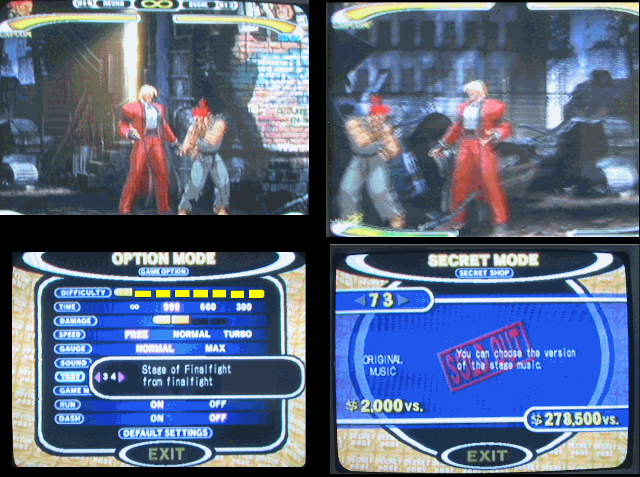 You can see the stage in the top two pictures. Nothing happens in the background but it certainly fits in with the Final Fight style of stages from the games. Now, below you can see the options. First off, unlock enough stuff and you can get the option to buy "Original Music" for the nice price of $2,000 vs. points. Buy it and then go to options and set the game music to "original" Now, instead of all the terrible tunes in this game you get classic tunes from earlier games! For the Final Fight stage the music from the first level is now played. When the classic music is off you get the tune "Needle" which is pretty crappy.