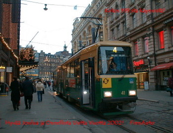 クリスマス気分のセンターにて撮影した、ヘルシンキのトラム。最近は新型車両も登場しています。こちらは従来型。