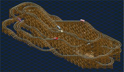 Big Reverser displays a method for creating EX class coasters from older style coasters. The Wooden Reverser will crash if the track corners too fast, so the quickest method to EX class - the fast, flat turn - is excluded. Of course, no inversions are possible. The remaining techniques for increasing intensity are increasing the track length and the number of drops. Fortunately these techniques work with the Wooden Reverser. It took 4,767 feet of track, 25 drops, and two lift hills to get the intensity to the point where EX class peeps are willing to ride it. For all that, a few of the most discriminating EX peeps will seek more intensity elsewhere. I was concerned about crashes with this coaster, so I stress tested it several times. Big Reverser's only crash in three tests came after 23 years of operation, well exceeding my 10 year benchmark.
