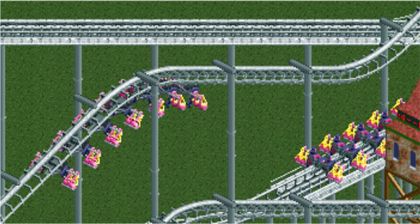 This picture is from the other side. At the top of the hill, the cars start to spin in a negative direction. The first two cars are at +180 degrees; the third car is in transition; the last four cars are still at +270 degrees. Since the track is above the cars, the 180 degree position means that riders have their head up.
