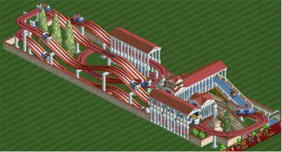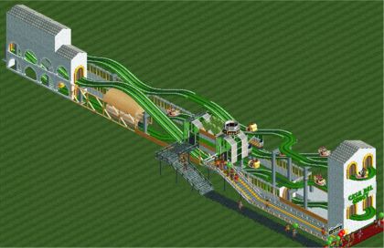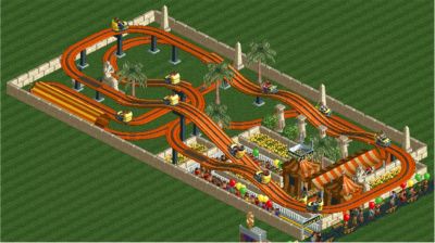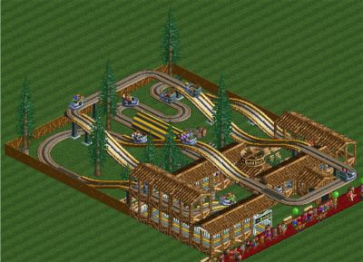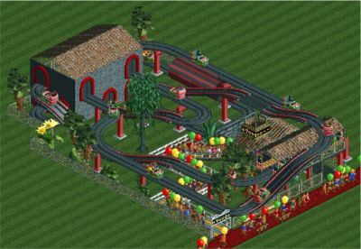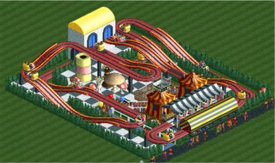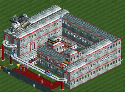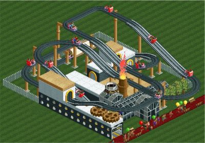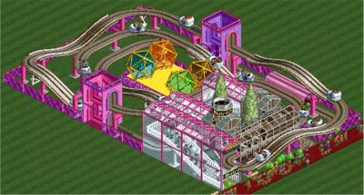 Note that Great Ceasar's Ghost can be built as a racer. The main feature of Ghost of the Final Frontier is that it is an indoor ride. It costs a bit to enclose most of the ride. The track design is built in layers to keep the scenery cost reasonable. The paths are built in the courtyard formed by the ride's building. The Great Oni is considered an indoor ride because most of its track is under a roof. This means that peeps will ride it while its raining. The Oni (oh-knee) is a supernatural being of Japanese mythology. A page devoted to them is The Oni Exchange Museum. Casa del Ghost is only two tiles wide. The design is delivered without paths. The long, narrow footprint allows placement in unusual, cramped situations. Only standard scenery objects are used. Build the end over a path for an excitement boost. I tried building Water Spirit directly on water in a game. The bushes looked a bit odd - although the duck-shaped plants "worked". Overall, the water theming and coloring turned this ghost train into a pleasing water ride. Yes, this one is expensive. The candy theming is pricey, and a dozen doors boost the cost further. Davy Jones Penthouse is a "top of the line" ghost train. It is a self-racing (mobius) ride, and offers pirate theming for your peeps' entertainment. After the ride has been running long enough to distribute cars around the track, click on "synchronize with adjacent station" for an excitement boost. |