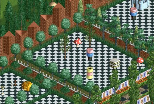 The two witches giggled with delight. Then the Pixie flew up into the air, and hovered for a moment, then whispered into Victoria's ear. "Why of course!" exclaimed Victoria. "The children need more than just a pretty place, they will need rides and places to eat and all sorts of things!" Victoria sighed. "I'm afraid, Miss Pixie, that creating rides is beyond our magic." "Well," said Patricia, "Do you have any ideas, Miss Pixie?" The Pixie nodded and smiled, and told them she knew just what to do. And then, before you could clap your hands together, you heard a Pixie whispering in your ear, "Please, please, can you help us build our park?" Note: Users of the U.S. version of RCT2: The first time you start the scenario, the custom scenery may cause an "Error Trapper" which terminates RCT2 and returns you to the Windows desktop. If this occurs, please try it again. The first time, the custom scenery is "exported" to the ObjData directory prior to failure. The second attempt to start the scenario should be successful. If you already have some of this custom scenery, the scenario will probably start without error. Users of the Australian version of RCT2: The first play tester who attempted to use this scenario was unsuccessful. A second play tester was able to use the scenario, with the same results as the U.S. version. Users of the U.K. version of RCT2: Some players report difficulty running the scenario, while others encountered no problems. If you experience difficulty, be sure to try running the scenario at least twice. If that fails, try downloading and installing the custom scenery that was used in the scenario (the links are below); that possibly could provide a solution. The link "Download as game file" is the scenario on March 1, Year 1. I have not heard of any problems exporting custom scenery from game (.SV6) files; so this may also be a solution.