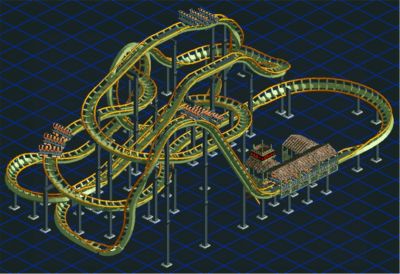 One of a coaster's most endearing characteristics is its ability to separate a peep from his money. By this measure, Vertical EX is a winner. Only 15 x 10, this tiny coaster can fit in an odd corner, yet tends to pull in the traffic. Expect a (very) small hesitation in a few of the block sections - there are seven block sections and four trains. In most of the other coasters in this collection, the ratio of block sections to trains is slightly over 2:1. It doesn't seem to bother the peeps - they jump, and that's really what counts.