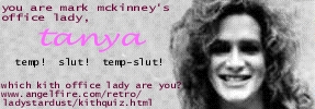 <a href="https://www.angelfire.com/retro/ladystardust/kithquiz.html"><img src="https://www.angelfire.com/retro/ladystardust/mark.jpg" border=0></a><br><font face=arial size="1"><a href="https://www.angelfire.com/retro/ladystardust/kithquiz.html">Which Kids in the Hall Office Lady are You?</a> |