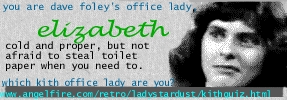 <a href="https://www.angelfire.com/retro/ladystardust/kithquiz.html"><img src="https://www.angelfire.com/retro/ladystardust/dave.jpg" border=0></a><br><font face=arial size="1"><a href="https://www.angelfire.com/retro/ladystardust/kithquiz.html">Which Kids in the Hall Office Lady are You?</a> |