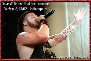 8/15/02- Some people say death is just a part of life.... But it becomes a cold reality when it hits one of your own. Dave was a true brother to us. We had the pleasure of knowing him for years before the world knew him as Dave "Stage" Williams from Drowning Pool. We are proud to say that in life he was the same person now as we knew back then. All the success, platinum records, etc never changed him. He was always the same big hearted, fun loving Dave, never a rock star... Just Dave. He loved music and most of all he loved his family, friends and fans. It's impossible to say with words how much fun it was to hang with Dave. He was the full package! His wit, charisma and drive to kick ass will be deeply missed by all.....