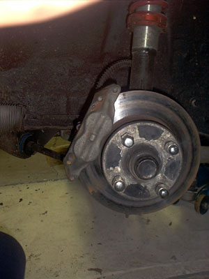 The Front brakes on the car use the Sumitomo four spot calipers, with a 260mm vented disk. (Unsure of the origin for the disk). These calipers work extremely well, and make changing brake pads very easy. They have two pins at the top of the caliper which simply slide out and the pads can be pulled out through the top of the caliper. Very easy and very fast. |