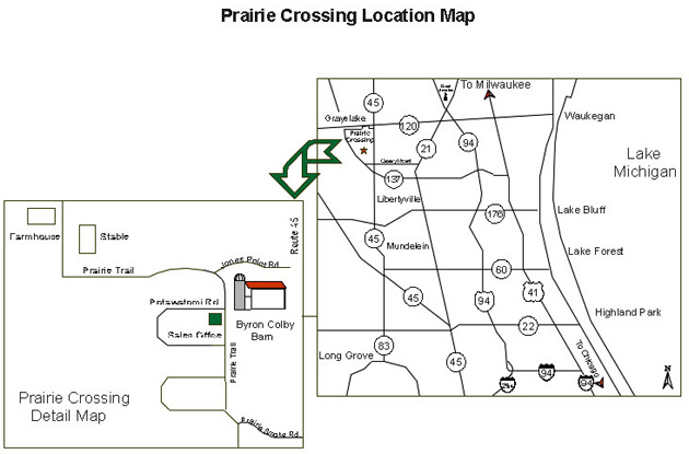 The LocationPrairie Crossing Stable is located 40 miles north of downtown Chicago in Grayslake, Illinois at 32400 North Harris Road, Grayslake, Illinois (central Lake County). The stable is one-half mile south of Route 120 on Route 45. Grayslake is one hour north of Chicago and one hour south of Milwaukee Coming from the south:Take the Edens and the Tri-State tollway (I-94) north to Route 120. Travel west on Route 120 to Route 45. Take Route 45 south one-half mile to the traffic light at the entrance of Prairie Crossing. Turn into Prairie Crossing on Jones Point Road. Turn right at the stop sign onto Prairie Trail. Coming from the north:Take I-94 south past Great America to Highway 21 (Milwaukee Avenue). Travel south on Highway 21 to Route 120 West. Continue three miles west to Route 45. Turn left onto Route 45 to the first stoplight (Jones Point Road), the main entrance to Prairie Crossing. Turn right at the first stop sign (Prairie Trail).