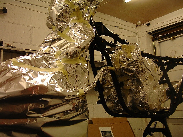 I had seen this method of wrapping the engine in tin foil and spraying the frame on another RE5 website and thought it was a great idea. I used 6 cans of PJ1 epoxy motorcycle frame paint in all as much is wasted, paint spraying in winter brings many problems when your facilities are limited.