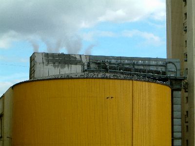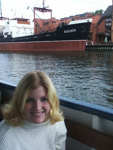 Back at the waterside, we spot a ferry called Motlawa, not sure where it goes, but for 1.5zl, doesn't really matter. Turns out that it goes to the other side of the river, Royal Island or "Wyspa Krolewska"...but this is where we spot a fantastic old sailing ship called Galeon Lew heading in our direction. Just a few minutes to the next trip, so we hand over 12zl each for the 45 minute trip. As we sail off, we get ourselves in many peoples photographs, as they snap away at the ship chugging it's way along the river. The ship itself is a wooden vessel, with all the rigging, an oldish Polish captain steering the tiller. Slightly cheating by using an engine rather than the sales, but it doesn't spoil the effect too much. Dotted around are various barrels, signs and memorbelia to add realism to the experience. Music plays in the background at a level which is enjoyable, and it ranges from quite jolly pirate movie music to mysterious and chilling. It seems to work quite well with the scenery, which we must admit can be extremely drab, grey, depressing and run-down. It's funny how we notice old decaying buildings literally with the walls falling apart, which the satellite dishes still manage to cling on to. The derelict factories and industrial areas with cranes rising to the sky, old ships rotting away, whilst others are being re-built. Just an odd cloud of waste gas emits from a few working plants. The mood on the ship is very quiet, there are a dozen or so of us on board, and I think we all are a bit stunned by this "tour". There's no commentry from the captain, his staff or anybody else, well we guess there really aren't too many "sights" around here. Half way, the ship turns round, and heads back in the same direction, but on the opposite side of the river, leaving us feeling a little cheated by the 45 minute ride, of course it's still quite cheap, and has shown us a side of Gdansk that we would have felt uneasy seeing on dry land.