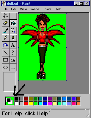 I used 100% green, or lime green, to fill in the background, because I didn't use that color anywhere on the doll. Fill in all parts that you want to be transparent.