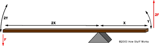 In the figure above, a force F is being applied to the left end of the lever. The left end of the lever is twice as long (2X) as the right end (X). Therefore, on the right end of the lever a force of 2F is available, but it acts through half of the distance (Y) that the left end moves (2Y). Changing the relative lengths of the left and right ends of the lever changes the multipliers.