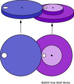 The right-hand (purple) gear in the train is actually made in two parts, as shown above. A small gear and a larger gear are connected together, one on top of the other. Gear trains often consist of multiple gears in the train, as shown in the next two figures.