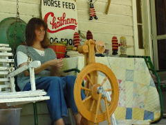 Jean Mistele Hand-spun, hand-dyed, hand-knitted items made from all-natural fibers; wool, flax, recycled cotton denim. Choose from socks, mittens, scarves, sweaters and more. She also makes hooked wall hangings and novelty items. On music Sundays you may find her on the porch with her spinning wheel, happy to chat about her craft. |