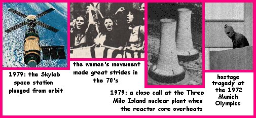 ![]() Launched in the late 1960s, the modern environmental movement was picking up steam and making headlines. 1970: The nation celebrated its first Earth Day, which was known as the First National Environmental Teach-In. All across the country, various events and activities brought attention to the nation's environmental issues. 1973: Congress passed the endangered species act, which bans trade in endangered wildlife and protects animal species determined to be at risk. 1971: The environmental action group known as Greenpeace was formed in Canada as the Don't Make A Wave Committee. Their name was changed to Greenpeace in 1975. Earth Day History Greenpeace ________________________________________ ________________________________________ ![]() 1974: Newspaper heiress Patty Hearst was kidnapped by the Symbionese Liberation Army, a radical group based in California. She spent 18 months with the group and participated in several illegal activies, including a highly-publicized bank robbery. After being apprehended, she was convicted of robbery and sentenced to prison, but her sentence was commuted by President Carter and she received a pardon from President Clinton. Her case focused on the controversial issues of brainwashing and the Stockholm Syndrome, in which a captive develops an affinity for their captor. The Patty Hearst Kidnapping ________________________________________ ________________________________________ ![]() the women's movement The modern women's liberation movement was launched in the late 1960s. In the early 1970s, equality for women seemed closer than ever. *The birth-control pill provided greater reproductive freedom for women. *Roe vs. Wade: in 1973, the Supreme Court legalized abortion. *Women burned their bras as an act of defiance. *More women began working in previously all-male occupations. The equal rights amendment prohibits legal discrimination based on gender. It was drafted and first submitted to Congress in 1923, and was introduced unsuccesfully in every Congressional session until 1970. In 1972, it finally passed both houses of Congress and was sent to the states for ratification. 38 states were required to ratify the amendment before its expiration date in 1979. With only three states to go, the deadline was extended to 1982, but the amendment failed to pass. Roe vs. Wade The Women's Liberation Movement NOW (National Organization For Women) ________________________________________ ________________________________________ ![]() 1972-1974: the Watergate scandal In 1972, Washington Post reporters Bob Woodward and Carl Bernstein exposed corruption in the nation's capital when they investigated the Watergate Hotel break-in. This scandal eventually caused the resignation of President Nixon. Original Washington Post Article Watergate Revisited Deep Throat --the Post's unidentified source President Nixon's Resignation Speech | ----- |